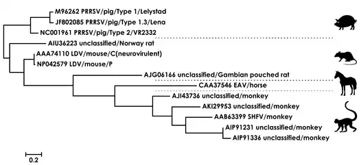PRRSV is a member of the family Arteriviridae, and order Nidovirales.[28] Other members of the family Arteriviridae include: equine arteritis virus (EAV), simian hemorrhagic fever virus (SHFV), wobbly possum disease virus, and lactate dehydrogenase elevating virus (LDV).[29]
