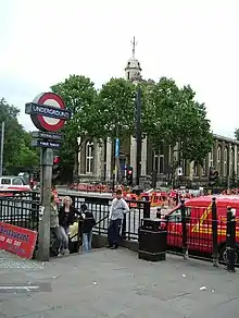 The station is an example of the style adopted by London Transport for new tube stations under the New Works Programme of 1935–1940. Extensive use is made of pale yellow tiling, originally manufactured by Poole Pottery. This has been replicated during the 2007 modernisation although several panels of original tiling were retained on the platforms. The finishes include relief tiles, showing symbols of London and the area served by the London Passenger Transport Board, designed by Harold Stabler. The station entrances, all in the form of subway access staircases to the subterranean ticket hall, all show the design influences of Charles Holden, the consulting architect for London Transport at this time.[38][39]
