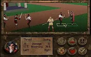 Combat is turn-based and takes place on a grid, similar to tactical role-playing games. The characters can move to a different location on the grid and if they can reach an enemy, can attack in the same move. There are two options for attacking: a thrust and a swing. The thrust is the default attack used when moving to attack an enemy. The swing often does more damage but is less accurate and uses up one point of health/stamina. Fighters can use crossbows and magicians can cast spells, but only if there are no enemy units in adjacent squares. The player can also rest, which regains health and stamina, defend against enemy mêlée attacks, or assess an enemy's capabilities.