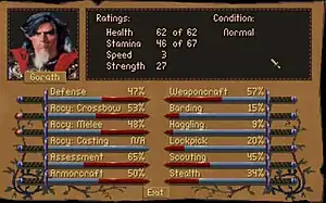 The character system is unique. The main character attributes are health, stamina, speed, and strength. Speed determines how many combat grid squares the character can move. Strength influences the amount of damage the character inflicts in mêlée combat. Spell-casting, swinging one's weapon, and combat damage first use up stamina. Once stamina is depleted, you begin to eat into health. Once it decreases, the character's skills (such as the crucial trait of weapon accuracy), as well as their movement speed, are adversely impacted.
