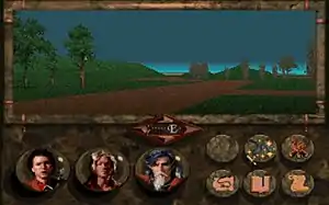 The game runs in 256-color 320x200 VGA mode. The graphics engine uses textured 3D graphics to draw the terrain and uses sprites for most of the detailed objects. The engine does not support multilevel terrain as such, but obstacles such as hills and mountains are supported. Most shops, inns, temples, special locations, and large cities are navigated through pictures usable through hotspots, while smaller towns have 3D buildings.