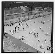 Construction for some of the 11 pools began in October 1934.[40][38] Even though there was already a pool at Betsy Head Park, Moses described its existing pool facilities as "an antiquated tank" that contained no filtration facilities; he proposed to refurbish it entirely as part of the WPA initiative.[19][20] The existing field house largely remained intact, except for some modifications to make way for an enlarged pool. The field house's lockers were replaced by baskets, and its interior was expanded so that 4,660 bathers per day could use the facilities, rather than 4,000.[41] By mid-1936, ten of the eleven WPA-funded pools were completed and were being opened at a rate of one per week.[33] Except for the Betsy Head Pool, each opening featured elaborate performances attended by La Guardia.[41] Betsy Head Park's pool was the ninth to open citywide.[42][43][lower-alpha 1] On August 7, 1936, Betsy Head Park's pool area opened without any ceremony or the mayor in attendance; over eight hundred children spread the news of the opening by word of mouth. The opening was arranged at the last minute, and the diving and wading pools were not yet complete.[44][45][46]