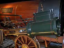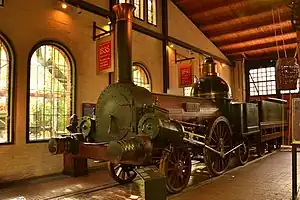BEUTH was a 2-2-2 steam locomotive manufactured by Borsig in 1843 and was the first steam locomotive developed independently in Germany.[3][4] Borsig had previously built locomotives based on American models. The locomotive won a race against a model by Stephenson by about ten minutes and was considered the prototype of fast German locomotive designs for the next ten years. A driving axle and two running axles as well as a vertical boiler ensured comparatively high speeds. It was named after the head of the Prussian trade academy Christian Peter Wilhelm Beuth, who had prophesied to August Borsig that nothing would ever come of it. A replica of the locomotive is currently on display in the German Museum of Technology in Berlin.