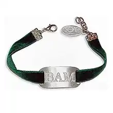 BAM bracelet All My Children’s Bianca and Maggie (BAM) may not be a soap super couple...YET! That doesn’t mean you shouldn’t show your support for the intriguing duo that can’t quite seem to get together (it’s like they’re distracted or something) with this stylish brushed-pewter/nickel-plated ID emblem featuring engraved lettering, a 6 ¾" velvet strap in forest green and adjustable chain strap. Limited edition.[62]