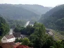 Later the Biebermühle–Burgalben section was rebuilt on a new route through the middle of the Schwarzbach valley (Schwarzbachtal) for military reasons.[14] The line was absorbed into Deutsche Reichsbahn on 1 April 1920. In 1922, the line was integrated into the newly founded Reichsbahndirektion Ludwigshafen (railway division of Ludwigshafen). In 1923, the so-called Regiebetrieb (military operation) commenced, which meant that the railway was operated by the French military until the beginning of 1924. In the course of the dissolution of the railway division of Ludwigshafen, the Biebermühl Railway came under the management of Saarbrücken on 1 May 1936.[15][16]