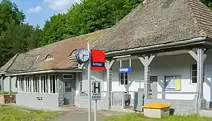 Its entrance building, which was built in a traditional style with a hip roof and an open waiting area, dates back to around 1910 and is heritage listed.[46] In the building itself is a mechanical signal box – officially abbreviated Sf – that was built to a unified design and was put into operation on 1 January 1954, replacing an external signal box.[27][47][48] The former loading track in the station has been dismantled in the meantime.[32]