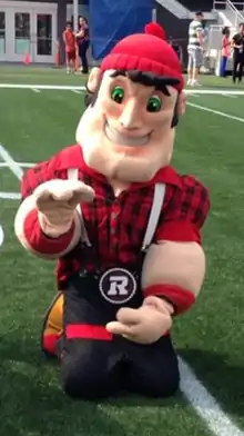 When originally named Big Joe Mufferaw, Redblacks owner Jeff Hunt stated, "We heard that fans loved the look of our mascot and hundreds said he had to be Big Joe Mufferaw. We like that name too because it reminds us of our city's past and fits so well into the branding of our football team."[4][5] The name was a reference to French Canadian folk hero, Big Joe Mufferaw, who is based on real-life Joseph Montferrand (French: Jos Montferrand), who is often credited as a lumberjack from the Ottawa Valley.[6] However, the name caused controversy and divided opinions, as some considered it offensive to Montferrand's surname.[7] Criticisms of the name arose, as some fans claimed the "Mufferaw" took away from the "Frenchness" of Montferrand, and alienated French-Canadians.[7] Due to the controversy, "Mufferaw" was dropped from the mascot's name.[8] The name change was praised, and was seen as both a possible way of building the team's fanbase, as well as a way of discussing French-Canadian history.[2]