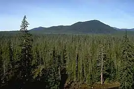The forested slope in the foreground is part of the Big Lava Bed, a 0.9 cu km lava flow erupted from the cinder cone in the background about 8200 years ago. The lava flow traveled 13 km from the source crater and is the youngest feature of the Indian Heaven volcanic field.