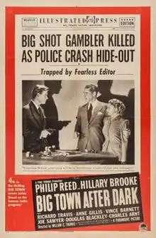 Big Town After Dark is a 1947 American crime drama film directed by William C. Thomas and written by Whitman Chambers. The film stars Phillip Reed, Hillary Brooke, Richard Travis, Ann Gillis, Vince Barnett, Joe Sawyer and Robert Kent.[1][2] It was released on December 12, 1947 by Paramount Pictures.The film was the third in a series of four films based on the long-running radio program Big Town.