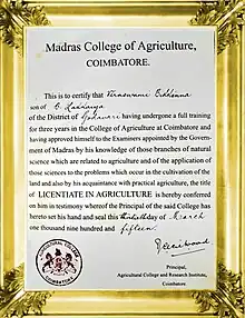 Alma materLicentiate in Agriculture From Madras College of Agriculture