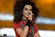 German site dw-world.com says that Kaulitz's look, young age and edgy hairstyle has helped him obtain icon status among many teenage girls.[23] Der Spiegel reports that Kaulitz is an icon within the LGBT community, which Kaulitz has embraced.[19] Kaulitz designs many of his own stage costumes, and despite poor drawing skills, the designs are constructed by his tailor.[24] The singer apparently collects suspenders, and is also "totally crazy about jackets". Kaulitz reports he has hundreds of jackets in his closet – though he has said that none of his jackets are real leather as he is opposed to using animal pelts/feathers for clothing.[24] He cites his fashion and style influences as David Bowie (particularly in the 1986 film Labyrinth), Nena, Vampires, Paris' secondhand shops, striking jewelry and Dior Homme.[24] He also cites Steven Tyler, Karl Lagerfeld and Hedi Slimane.