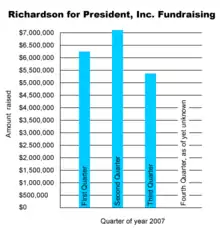 The Bill Richardson for President Exploratory Committee raised $6.3 million in the first quarter of 2007. As of April 1, 2007, the campaign had $5 million cash on hand.[8] This was the fifth highest amount raised among the eight candidates for the 2008 Democratic nomination.[9]
