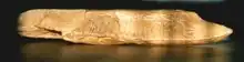 One bone fragment, an elephant tibia, has two groups of 7 and 14 incised parallel lines and might represent an early example of art. The regular spacing of the incisions, their subequal lengths and V-like cross-sections suggest they were created at the same time, with a single stone tool. The tibia dates to between 350,000 and 400,000 years ago.[2] The interpretation as an early calendar is a possibility.