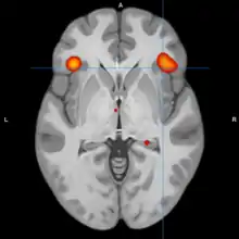 Bilaterally reduced activity in the inferior frontal gyrus (BA47).[69] Image at Talairach z=2