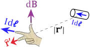 where is a vector along the path whose magnitude is the length of the differential element of the wire in the direction of conventional current, is a point on path , and is the full displacement vector from the wire element () at point to the point at which the field is being computed (), and μ0 is the magnetic constant. Alternatively: