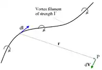 The figure shows the velocity () induced at a point P by an element of vortex filament () of strength .