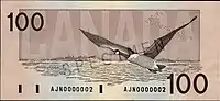 The pink-hued $1000 banknote has an obverse with the same portrait of Elizabeth II used on the $2 banknote adjacent to a vignette of the Centre Block and Library of Parliament, the modern flag of Canada flying from the Peace Tower.[15][27] The reverse features a pair of pine grosbeaks, the engraving of which was based on a watercolour by John Crosby.[27] Originally, it was intended to use an image of a spruce grouse, but its nickname "fool hen" was "considered too controversial".[27] This was the first new $1000 bill printed since the 1954 Canadian Landscape series.