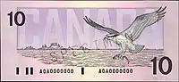 The prime minister featured on the $10 banknote obverse is John A. Macdonald, whose portrait was engraved by Thomas Hipschen of the Bureau of Engraving and Printing in the United States.[22] Adjacent to the portrait is a vignette of the buildings of Parliament as they were during his premiership, flying the Canadian Red Ensign.[22] The bird featured on the reverse is an osprey.[11] The purple banknote was introduced on 27 June 1989 and withdrawn on 17 January 2001.[23]