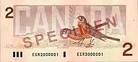 The $2 banknote has an obverse featuring Elizabeth II, the Queen of Canada at the time of its introduction on 2 September 1986.[16][3] A photograph by Anthony Buckley was the basis of the portrait, which was engraved by Henry S. Doubtfire of De La Rue.[17] Adjacent to the portrait is a vignette of the Parliament buildings.[17] The reverse of the terra cotta banknote features American robins.[3] This note would be the last Canadian $2 banknote, as the government announced during the 1995 Canadian federal budget speech that it would be withdrawn from circulation.[18] It was withdrawn on 16 February 1996 and was replaced by a $2 coin, colloquially referred to as the toonie.[2]