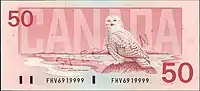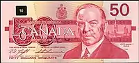 The obverse of the red $50 banknote includes William Lyon Mackenzie King, and the reverse has the snowy owl depicted on a background of an Arctic landscape.[12] This portrait was also engraved by Thomas Hipschen, and was placed adjacent to the Parliament buildings flying the Canadian Red Ensign.[27] The colour of this banknote differed slightly from the same denomination in the Scenes of Canada series, as its hue was blue-red instead of the earlier banknotes orange-red.[27]