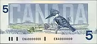 | $5 | Blue | Wilfrid Laurier | Belted kingfisher | 1986 | 28 April 1986 | 27 March 2002 |