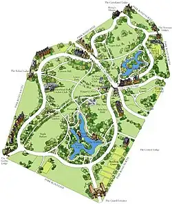 The park took five years to build and was officially opened on 5 April 1847 by Lord Morpeth, an estimated 10,000 people attended on the day.[6][7] The park had an informal style rather than a structured neatly arranged urban garden. Several miles of drainage pipes were laid to remove the water from the marshy land. During construction, hundreds of tonnes of stone and earth were moved to create well-drained terraces, hills, rockeries and lakes. It also led to the diversion of Old Bidston Road and the loss of a direct route between Claughton and Woodside. Paxton planted trees and shrubs at various places so visitors would enjoy the surprise of unexpected views or hidden features as they wandered through the park. Buildings included the Swiss Bridge, Boathouse, Norman Lodges, Gothic Lodge, Castellated Lodge and Italian Lodge. The Grade II* listed Grand Entrance, which embodies many aspects of a Triumphal arch with Ionic features, was designed by Lewis Hornblower, with amendments by Paxton.[4]
