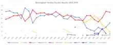 From the seat's creation in 1918 until the 2005 general election, the MP elected for Birmingham Yardley was on all but three occasions a member of the party that won the general election, making it a former bellwether seat. Exceptions were Labour wins in the constituency compared to Conservative wins nationally in 1951, 1955 and 1992.