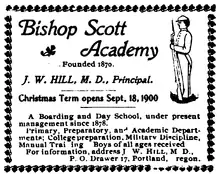 The academy was related to an earlier attempt by Scott to found a diocesan school.[1] The Reverend William Richmond had started a school at Yamhill in 1852.[2] Bishop Scott moved Richmond's school to present-day Lake Oswego, Oregon, where Scott had purchased 70 acres that included a school building dating to 1850. Here Scott established the Diocesan School for Boys.[3] Bernard Cornelius, a graduate of Trinity College, Dublin, was appointed in 1856 by Scott as principal over 17 boarders. A primary department opened in 1858, and the school was renamed Trinity School for Boys. The school offered "both religious and secular education".[3][4] Cornelius resigned in 1860, and the school closed for two years. In 1862 it reopened under leadership of the Reverend Michael Fackler. Although Cornelius returned to the reigns in 1863, he could not halt declining enrollment. Trinity school closed in 1866[5] and the trustees sold the property.[3][6]