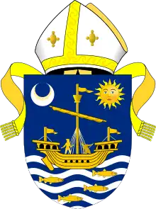 The diocesan arms are described as follows: Azure, in base on water barry wavy proper therein fishes naiant Or, an ancient galley manned, sail furled of the last, in chief a crescent Argent and a sun in splendour also of the second. . These arms were granted by the College of Arms under Letters Patent dated 24 November 1949.[8]