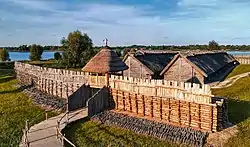 Biskupin is an archaeological site and a life-size model of a late Bronze Age fortified settlement in north-central Poland that also serves as an archaeological open-air museum. When first discovered it was thought to be early evidence of a West Slavic settlement, but archaeologists later confirmed it belonged to the Biskupin group of the Lusatian culture from the 8th century BC. The excavation and the reconstruction of the prehistoric settlement has played an instrumental part in Polish historical consciousness.