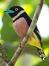 The black-and-yellow broadbill (Eurylaimus ochromalus) is a species of bird in the typical broadbill family Eurylaimidae. A small, distinctive species, it has a black head, breastband, and upperparts, a white neckband, yellow streaking on the back and wings, and vinous-pink underparts that turn yellow towards the belly. The beak is bright blue, with a green tip to the upper mandible and black edges. It shows some sexual dimorphism, with the black breastband being incomplete in females.