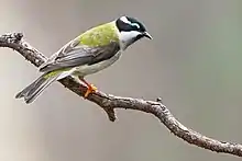 A mid-sized honeyeater ranging from 14 to 16 cm (5.6–6.4 in) in length, it is olive-brown above and buff below, with a black head, nape and throat, with a bluish patch of bare skin over the eye and a white crescent-shaped patch on the nape. The legs and feet are orange. Juveniles have an all-over browner plumage. It makes a scratchy creep-creep-creep call, as well as a more musical one.[7] Ford noted that individuals from southeastern Queensland northwards had more yellow-tinged upperparts and paler underparts; and that those of northeastern Queensland more matched the golden-backed subspecies, though the bare skin around their eyes remained aqua-blue.[3]