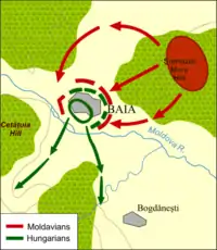 - 1 2 Matthias I was proclaimed king by the Estates, but he had to wage war against Frederick III, Holy Roman Emperor who claimed the throne for himself.[64] Several magnates, such as the Újlaki family, the Garai family and the Szentgyörgy family, supported the emperor's claim and proclaimed him king against King Matthias; the emperor rewarded the brothers Sigismund and John of Szentgyörgy and Bazin with the hereditary noble title "count of the Holy Roman Empire" in 1459 and they thus were entitled to use red sealing wax.[64][65] Although the Counts Szentgyörgyi commenced using their title in their deeds, in the Kingdom of Hungary, public law did not distinguish them from other nobles. The tide turned when they were pleased by Matthias' promises, changed their affiliation and joined forces with him. The second battle thus was successful in defending the Hungarian crown and the integrity of the nobility. The precise location of the battle is unknown since the historical records only guess where it could have situated.