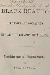 Black Beauty: His Grooms and Companions, the Autobiography of a Horse is an 1877 novel by English author Anna Sewell. It was composed in the last years of her life, during which she was bedridden and seriously ill.[1] The novel became an immediate best-seller, with Sewell dying just five months after its publication, but having lived long enough to see her only novel become a success. With fifty million copies sold, Black Beauty is one of the best-selling books of all time.[2]