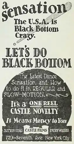 The Black Bottom is a dance which became popular during 1920s amid the Jazz Age. It was danced solo or by couples. Originating among African Americans in the rural South, the black bottom eventually spread to mainstream American culture and became a national craze in the 1920s.[1] The dance was most famously performed by Ann Pennington, a star of the Ziegfeld Follies, who performed it in a Broadway revue staged by Ziegfeld's rival George White in 1926.[2]