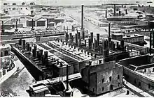 When Black City began growing beyond its borders, oil industrialists started to look for new convenient areas to serve their needs. Soon a new industrial area to the east of Black City emerged and became known as White City. By the end of 1902, up to 20 more large oil refineries and oil-related trade businesses were built here such as Mantashev and Co., Caspian–Black Sea Society and Shibayev's Chemical Plant.[3] Unlike Black City, White City accommodated more modern and better functioning refineries and therefore, the area was not as polluted.[13] In 1882–1883, the Nobel brothers founded an industrial community on the border of Black City and White City called Villa Petrolea.[15] By 1905, most oil refineries of Baku were located there.[16]