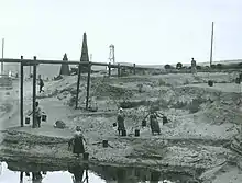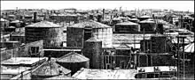 Baku was incorporated into the Russian Empire in 1813 under the Treaty of Gulistan. At that time it was a small town of 10,000 inhabitants.[1] The world's first oil well was drilled at Baku in 1847/1848, and was soon followed by many more.[2] The first oil refining plants were built in 1859 in the city suburbs.[1] By the 1860s the Baku fields accounted for 90% of the world's oil supply.[2] Industrial buildings came to occupy large sections of the city. Plants and factories were hazardous to the population due to air pollution from their smokestacks. Public pressure forced the provincial authorities to consider developing a separate industrial zone. In 1870, the authorities suggested that pasture lands to the east of the city be allotted for construction of oil refineries.[3] By 1872 there were almost sixty refineries in Baku producing kerosene. A law was passed prohibiting the construction of any new plants in the city, and allocating a new district outside the city limits for refineries.[4]
