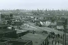By 1874 there were 123 refineries in what would become known as "Black City".[4] The refinery district was about 8 miles (13 km) from the shipping ports.[5] An industrial area plan was completed in 1876. Some of the farms and pastures of the neighbouring village of Keshla were zoned to accommodate replacements for factories that had been dismantled in the city. The new industrial zone was 2 kilometres (1.2 mi) from residential areas. To prevent further pollution, the new zoning law prohibited oil refineries from being built within the residential area.[3] By 1880, there were 118 industrial businesses functioning in the Black City area.[3]