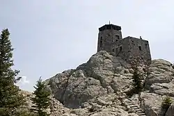 An old stone tower, once used as a fire lookout tower, is located at the summit. The ashes of Valentine McGillycuddy were interred near the base of the tower and a plaque reads, "Valentine McGillycuddy, Wasicu Wakan." Wasicu Wakan is Lakota for "Holy White Man."[37]