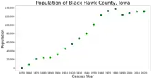 Black Hawk County is a county in the northeastern part of U.S. state of Iowa. As of the 2020 census, the population was 131,144,[1] making it Iowa's fifth-most populous county. The county seat is Waterloo.[2]