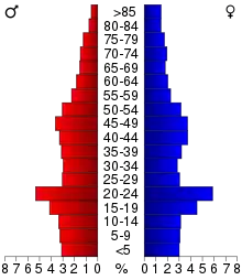 Age spread: 23.10% under the age of 18, 15.70% from 18 to 24, 25.20% from 25 to 44, 22.00% from 45 to 64, and 14.00% 65 or older. The median age was 34 years. For every 100 females, there were 92.30 males. For every 100 females age 18 and over, there were 88.80 males.