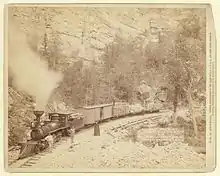 Train on the Black Hills and Fort Pierre Railroad through Elk Canyon in 1890.