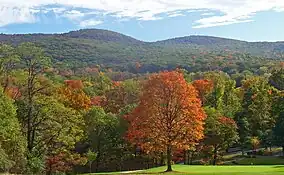The Scenic Trail, the longest in the forest at 5.9 miles (9.5 km), runs from its western trailhead on Old Mineral Springs Road near the falls atop the ridge past Spy Rock to end at a junction with the Stillman near Mount Misery.[11] The Stillman Trail, named for the forest's founder, is actually a continuation of a trail that begins in Cornwall on Hudson and goes over Storm King, then crosses 9W into the forest. It runs 5.3 miles (8.5 km) across the forest and over Black Rock to end at an overlook to Schunemunk Mountain and Mountainville near the forest's western boundary.[12]