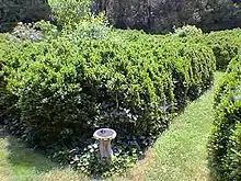 The Black Walnut plantation complex grew to encompass a variety of domestic and agricultural outbuildings; the main house served as the focal point. Domestic outbuildings, including a smokehouse, dairy, kitchen, and icehouse, were placed in a U-shaped cluster to the rear, or west, of the main house. Slave quarters and agricultural outbuildings were more isolated from the main living area. A formal boxwood garden was laid out south of the main house, and a terraced vegetable garden was situated to the northwest. A variety of native and ornamental trees and shrubs landscaped the grounds, and the entire complex was enclosed by woodland. A family cemetery was situated northwest of the house.[2]