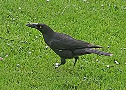 The black currawong (Strepera fuliginosa), also known locally as the black jay, is a large passerine bird endemic to Tasmania and the nearby islands within the Bass Strait.[2] One of three currawong species in the genus Strepera, it is closely related to the butcherbirds and Australian magpie within the family Artamidae. It is a large crow-like bird, around 50 cm (20 in) long on average, with yellow irises, a heavy bill, and black plumage with white wing patches. The male and female are similar in appearance. Three subspecies are recognised, one of which, Strepera fuliginosa colei of King Island, is vulnerable to extinction.
