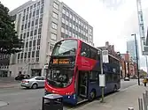 The Red Express brand is used on service X41, which operates hourly between Accrington and Manchester via Haslingden. In January 2020, the service was announced to be axed, but was later reprieved.[21][22] As part of this, the former double-deck Volvo B7TL/Wright Gemini vehicles allocated were replaced with single-deck Volvo B7RLE/Wright Eclipse Urban vehicles, branded in a two-tone yellow and red livery. Features include free WiFi, USB charging and audio-visual next stop announcements.