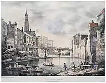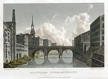 The current Blackfriars Bridge replaced an earlier, wooden structure, dating from 1761. This was erected by a company of comedians keen to allow people from Manchester to easily cross the Irwell, to visit the Riding School on Water Street in Salford, where they performed.[1] For the rest of its life it was maintained at the public's expense. A series of 29 steps[nb 1] led from the Manchester side of the river down to its flagged surface.[2][3] It was named Blackfriars Bridge, as Blackfriars Bridge in London was then being built.[4]