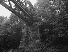 The Blackledge River Railroad Bridge was rebuilt to increase the flood clearance and the load-bearing capacity of the bridge, but its abutments were integrated into the new bridge.[2] Completed c. 1912, the replacement Blackledge River Railroad Bridge is a riveted steel, double-intersection Warren deck truss.[2] The original granite stone abutments which supported the previous bridge was reported to be five feet lower, were integrated with the brownstone abutments of the rebuilt bridge.[2][10] The bottom chord of the span is 32 feet (9.8 m) above the Blackledge River. The truss is 108 feet (33 m) long and about 18 feet (5.5 m) deep.[2] The top and bottom chords are typical box girders with diagonal members and the deck is open.[2] At some point, the bridge was altered with the addition of a sewer pipe.[2]
