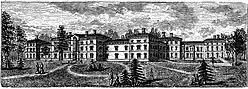 Butler Hospital, located off Blackstone Boulevard, is Rhode Island's only private mental health hospital. Founded in 1844, the hospital offers psychiatric and substance-abuse treatment programs.[10] The hospital was built in 1847 on the Richard Browne Farm at the end of Rochambeau Avenue.[1] The building is a huge Gothic structure surrounded by landscaping, built according to the philosophy of the time to remove patients from the stresses of urban life to a rural setting.[1]