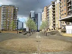 The 1980s, Blackwall saw the area first redevelopment project, a luxury housing complex called Jamestown Harbour over the Blackwall Basin, designed by WCEC Architects for the Wates Group and was completed by 1985. Jamestown Harbour was one of the first housing developments of the London Docklands. With its brick-built warehouse-style exteriors and distinctive blue and red balconies, it was designed to recreate the appearance of traditional river and dockside warehouses.[22]